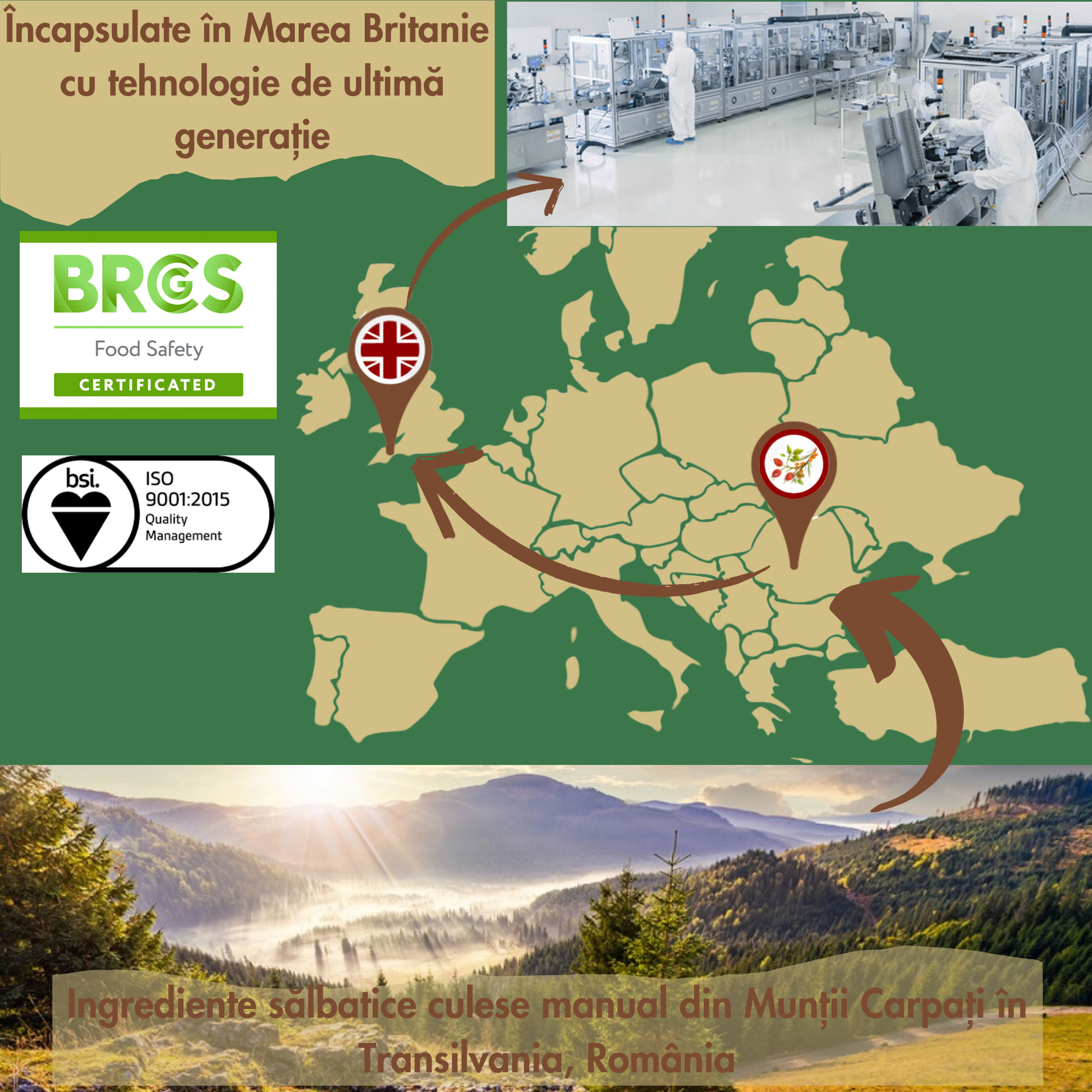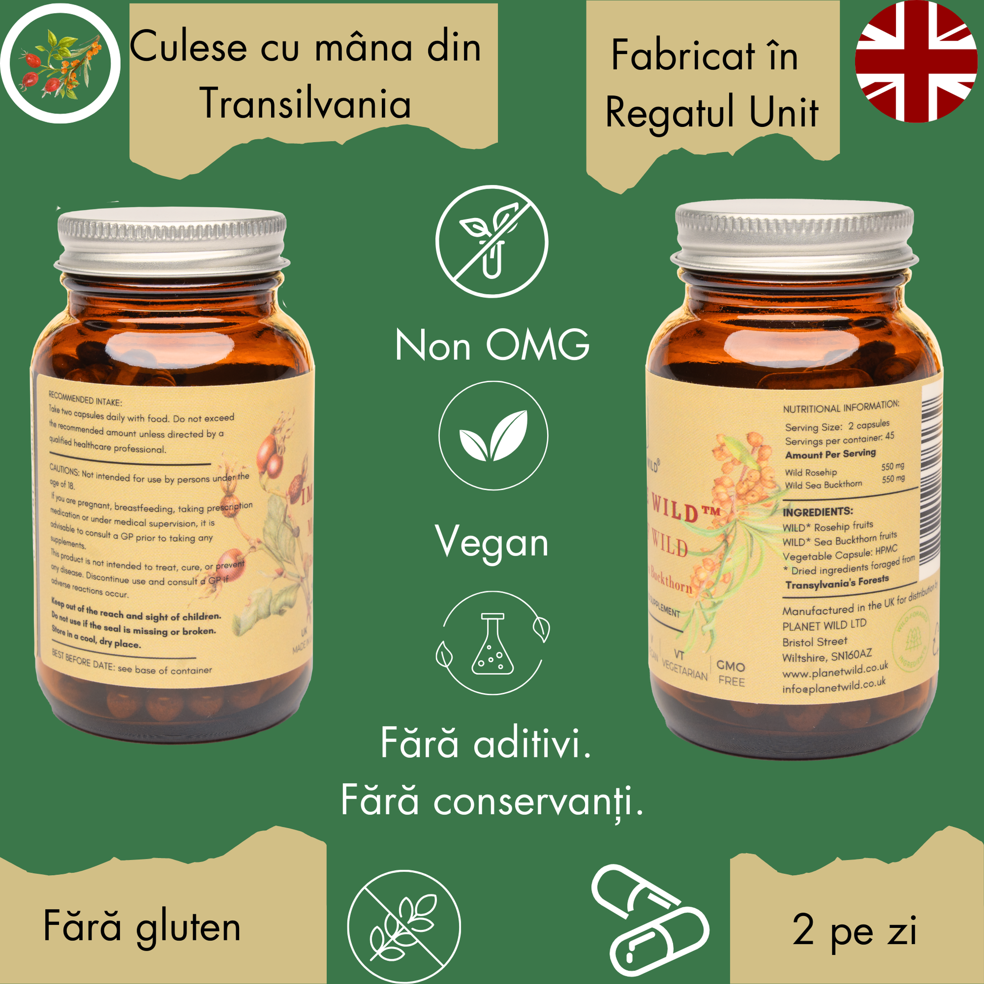 Stimulează-ți Sistemul Imunitar în mod natural. Formula puternică Immune Wild™ este un amestec 100% natural și pur de Cătină și Măceșe sălbatice, două plante medicinale tradiționale în care agenții antioxidanti și antiinflamatori apar în mod natural. Aceștia protejează și ajută la funcționarea normală a unui sistem imunitar puternic și sănătos. Ambele ingrediente sunt bogate în vitamine, dar pentru a menționa doar câteva: Omega 3, Vitamina C, Vitamina E, Vitamina K, Fier, Calciu, Potasiu, Magneziu, Siliciu, Sodiu, Zinc. Vei primi o cantitate suficientă pentru 6 săptămâni, sub forma a 90 de capsule concentrate, ușor de administrat, potrivite pentru toate vârstele și prietenoase cu veganii. Ingrediente Made of Wild sunt unice: 100% fructe de pădure sălbatice, culese manual în sezon, direct din pădurile neatinse ale Transilvaniei, din centrul României. Produs în Marea Britanie la standarde înalte.